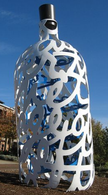 This Hollow Bottle can have any pattern hollowed our of the steel and stands tall and interesting, particularly if you add lighting for night reflections.
